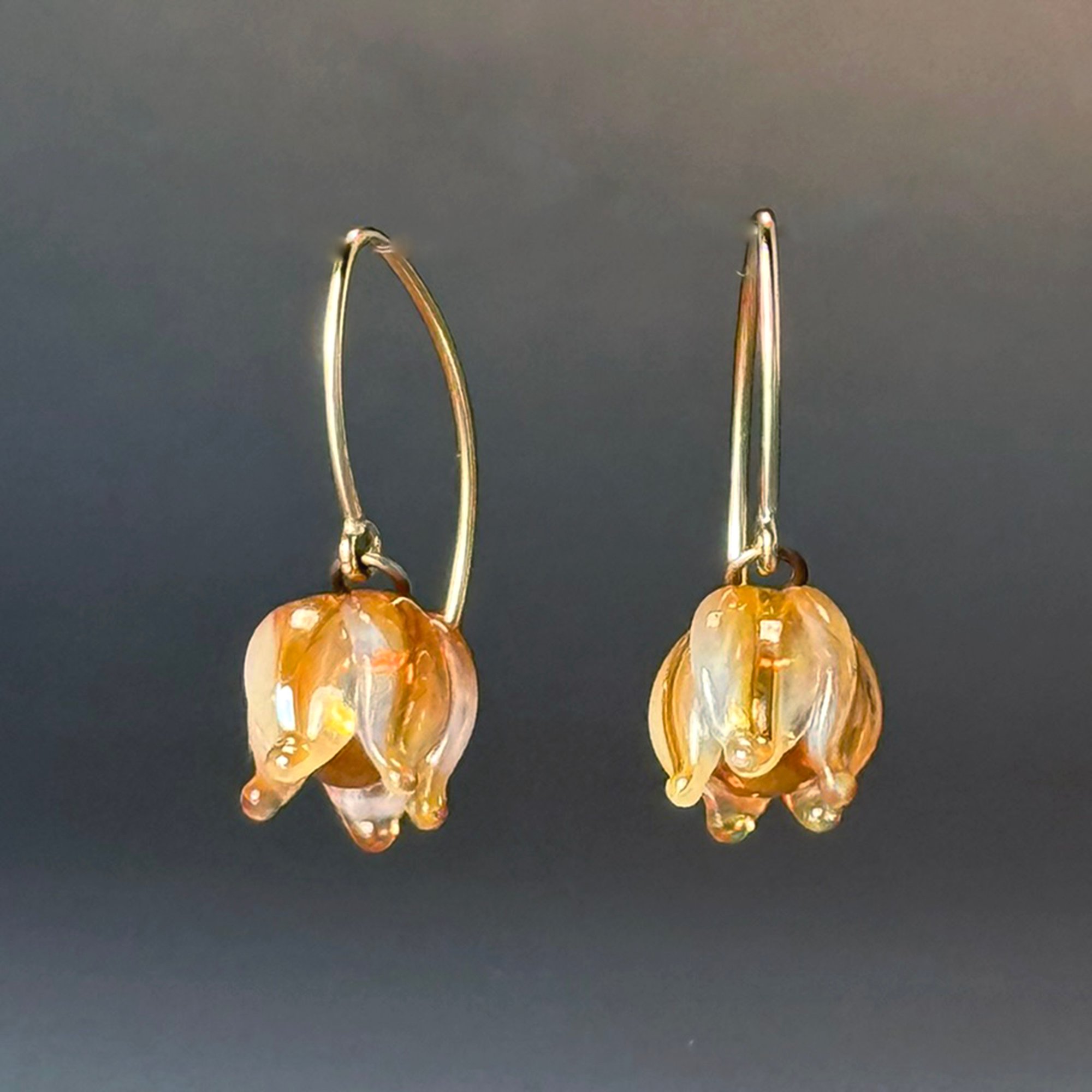 Hidden light peeks through the delicate fragility of golden glass flowers, glowing softly in gold. The flowers are created one at a time in the flame with a hand-mixed glass color. Beginning with gold-filled wire and glass rods, the artist hand-forms a flowing gold-filled structure to hold each flame-made flower.